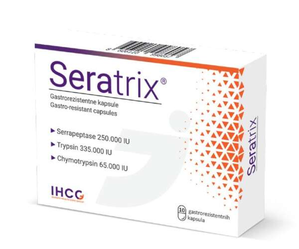 Seratrix kapsule su dijetetski suplement koji predstavlja moćnu kombinaciju tri proteolitička enzima. Formulisan je u obliku gastrorezistentnih kapsula proizvedenih posebnom tehnologijom. Ova tehnologija im omogućava da sigurno prođu kroz želudac bez rastvaranja i gubitka aktivnosti u kiseloj sredini, te da se neometano resorbuju u crevima i ispolje sistemsko dejstvo.